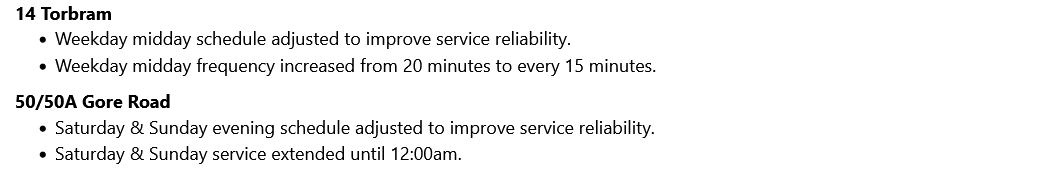 - Weekday, Saturday and Sunday schedules adjusted to improve service reliability.