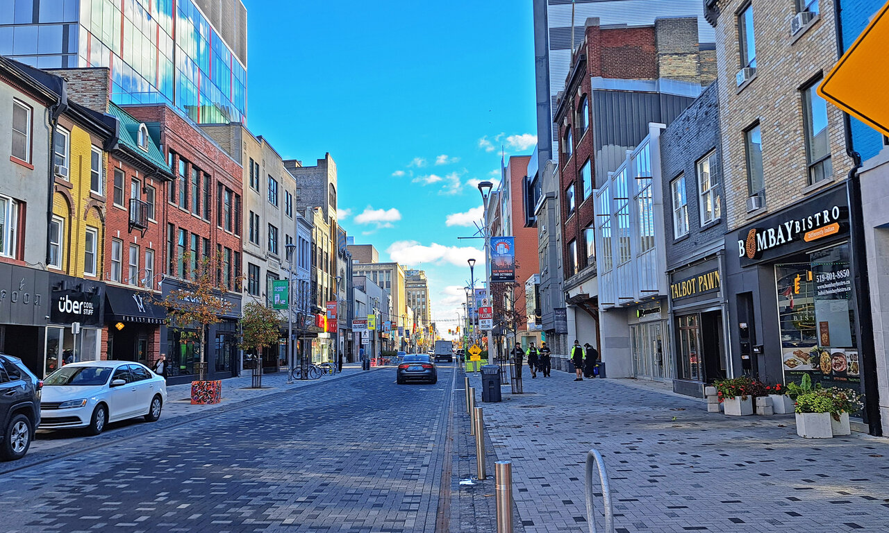 They did some kind of project to fancy up Dundas, London's main street. It doesn't really work and clashes with the surrounding buildings. London has always taken active measures to discourage street life and you can see that street life has been actively discouraged. In the 70s and 80s, downtown was still a place where people went but over the following decades the cultural memory of a downtown was lost and now it's just empty. But, cleaner, I guess. They are slowly building some really dismal condos but that hasn't translated into feet on the streets so far.