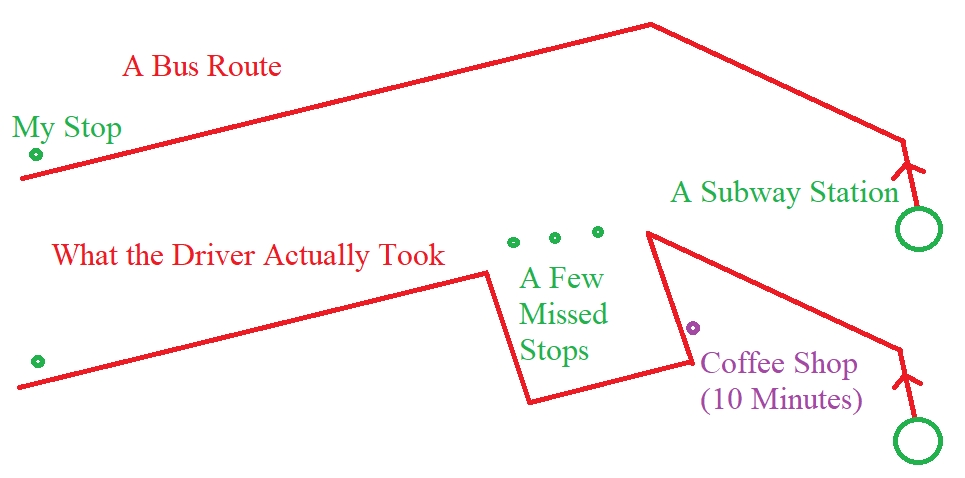 Depending on the route, drivers have no choice to stop along the route to get something to drink or want something different than what may be found at the end of the route. In some cases, they need more to drink, especially on hot days. Some drivers will inform the riders what they are doing, well others say nothing at all. Being behind the wheel for long or short hours has its challenges.