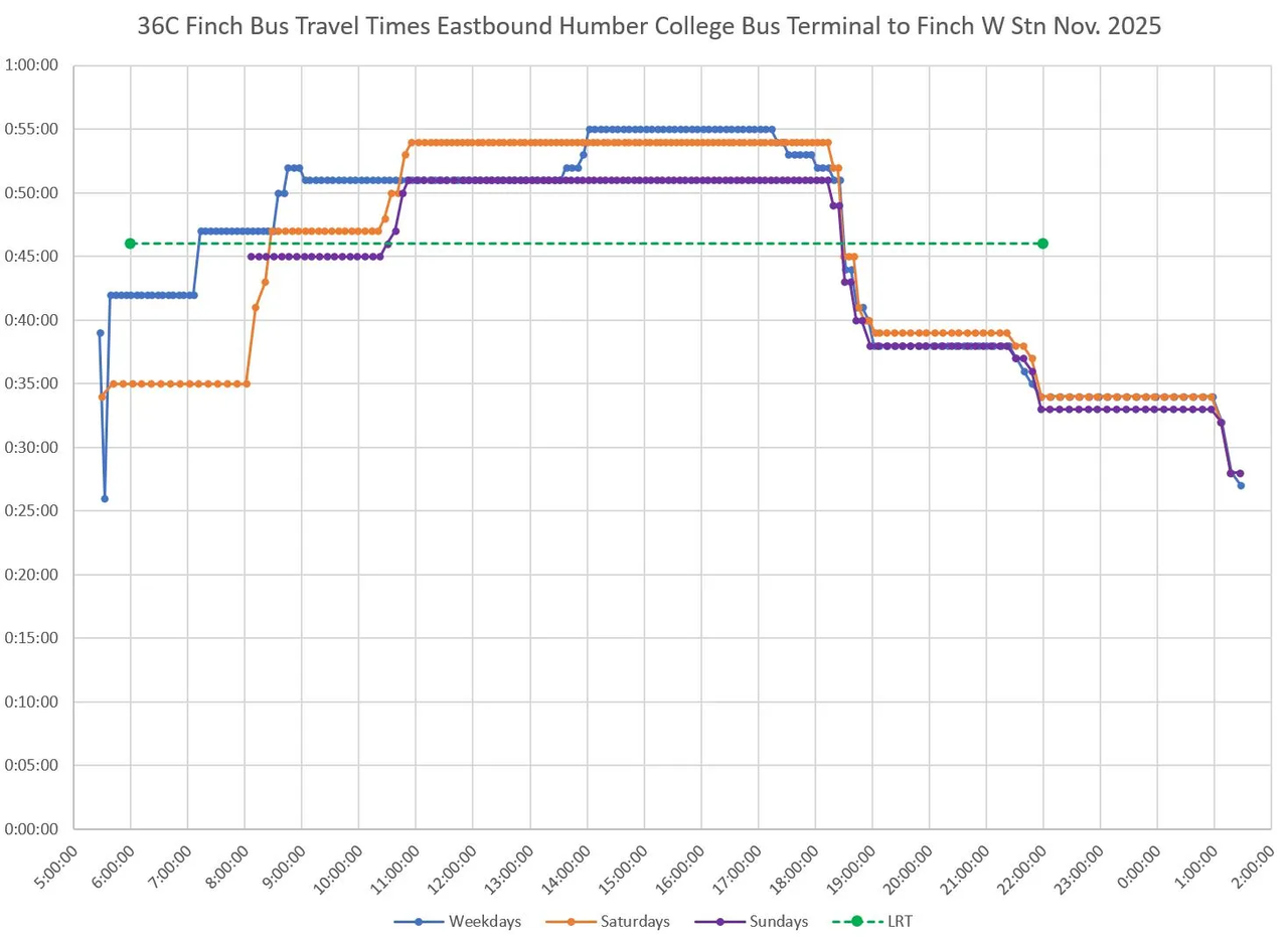 Note that this analysis intentionally excluded the excruciatingly slow curve between Humber College and Westmore. That portion of the trip took 3 minutes to complete (11:34 to 11:37). So if we include that portion in the above analysis, the extrapolated trip time for the fully signal priority enabled line will be 29 minutes.