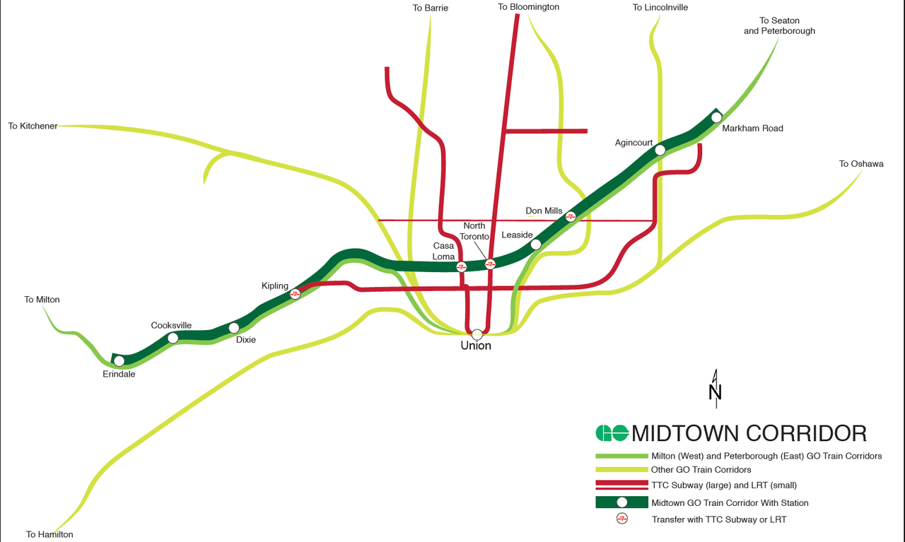 The Midtown GO Train line is a possible name for a decades-old proposal for GO Transit to route commuter trains off of the tracks into Union Station and along the Canadian Pacific tracks running through the middle of Toronto, north of Dupont Street. Such a route could connect with the Toronto subway at Kipling, Dupont and Summerhill stations before heading to the northeastern reaches of Scarborough. West of Kipling, a Midtown train would follow the route of the GO Milton line, serving the middle and northwestern stretches of Mississauga. East of Scarborough, the Midtown train could bring commuter rail service to the planned community of Seaton in northern Pickering, and even to the city of Peterborough.