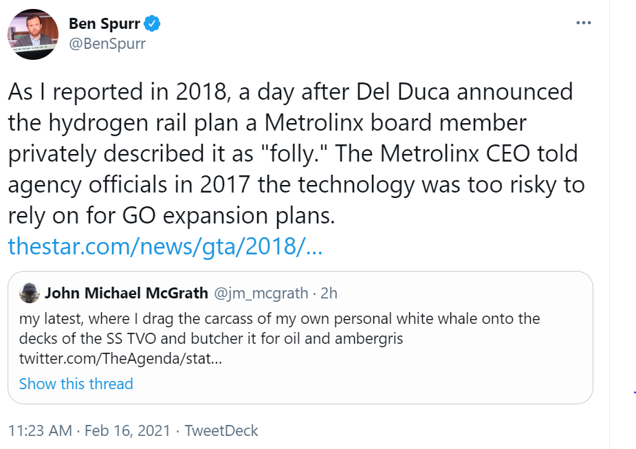 Also part of you never saying hydrogen is better than battery is because after it became clear that hydrogen was never being chosen, you switched from spamming this thread with only hydrail posts to spamming this thread with posts about why Metrolinx doesn't just choose battery or hydrogen and posts about hydrail and posts about battery trains.I know this whole project has gone out for request and the best bid regardless of the technology or even trains proposed and Metrolinx will base it's decision upon that but that is hypothetical. Metrolinx is at the beck and call of Queen's Park as both Wynne and Ford have clearly shown. Ford will make the final decision and he will do whatever he wants. One thing Ford has already proven in spades is his willingness to completely ignore recommendations and do what is most advantageous for him personally. This is why I think Ford will choose Hydrail.