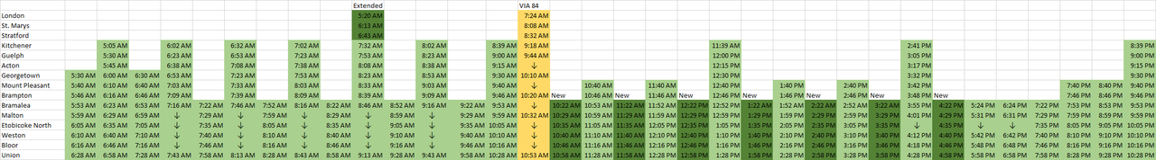 I compiled the new trips from looking at Go Transit's trip planer and London extension into a schedule. The new trips/extension are dark green