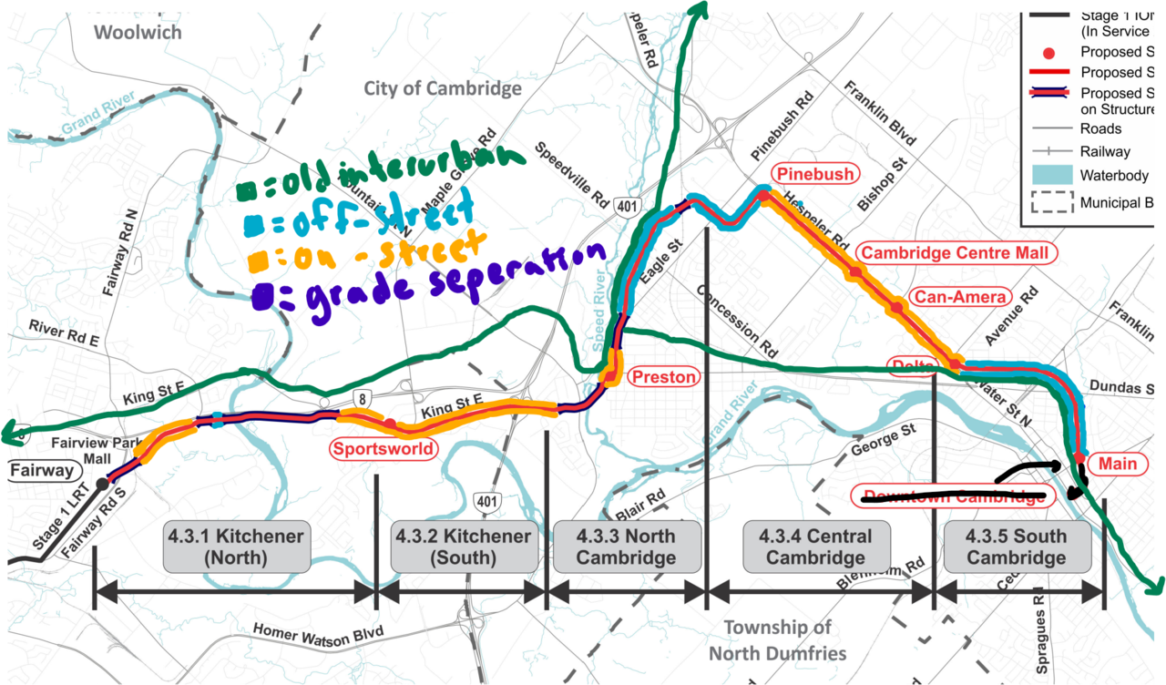 The notion that ION stage 2 will be an " extensively slow service" is unfounded. Large parts are totally graded separated or are off street (nonetheless following the route of the old interurban). The on street parts are completely straight compared to the many turns of stage 1. With 7 stations in 17 km I would expect it to take 30 or less minutes to Fairway. the real problem is it will feed into the slow sections of ion stage1 (reverse Eglinton situation)