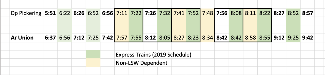 When you take the old (2019) express timings and insert them in the current schedule, its interesting how few overtakes are actually needed to introduce some express runs - and if that were done, some of the "trippers" that originate at Oshawa/Whitby and only make one trip to Union before laying up might be adjustable by a couple minutes.