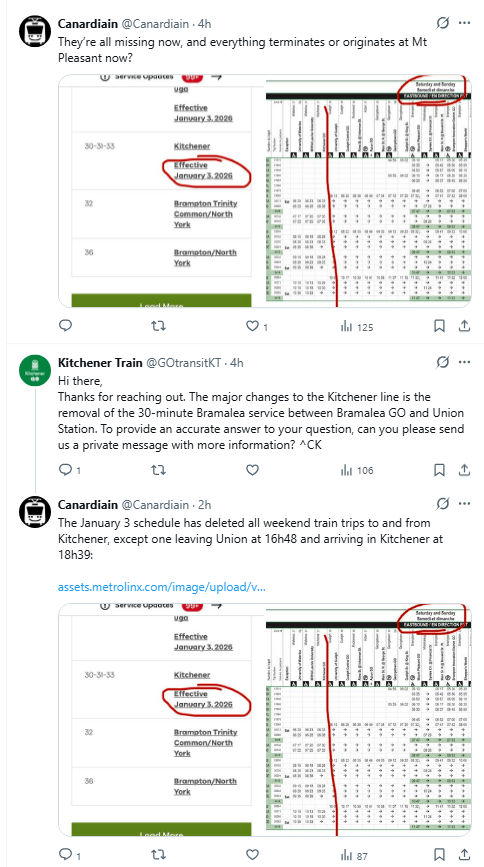 The missing weekend trips to Kitchener were luckily just a copy/paste error in the PDF, but the Lakeshore East and West service cuts seem to be real. We're 4 days from the next schedule change and the only Lakeshore timetables are the ones effective December 20th with service slashed to 1 train per hour. A far cry from the 15-minute service we had in the summer.