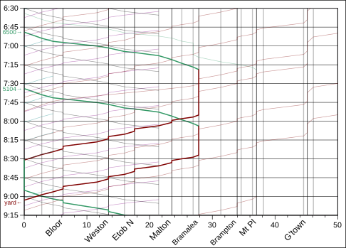 There's currently a six-car train that arrives at Union from Gormley at 7:11, sits out most of the peak period in a yard, and then does the 8:55 trip to Mount Pleasant. I'm guessing they'll have this one do the 8:27 Bramalea trip and then go out of service until the evening, and then the train currently on the Malton trip would do the new 7:55 and turn back as the 8:55.