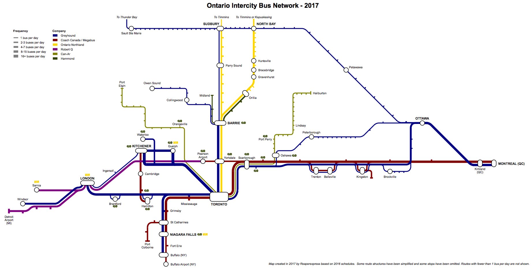 The map includes Ontario Northland, since it operates much the same as a private intercity bus carrier. Originally I was going to include GO buses as well, but it was making the area around Toronto completely cluttered with thick green lines. I decided to instead just show GO and VIA connections using icons.
