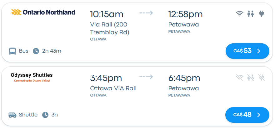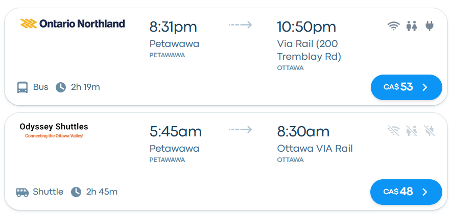 1. Advertising. It's not part of a larger network like Flixbus that has resources and trip planning applications to promote it. Including the trips in Ontario Northland's trip planner would go a long way to promote the service among people already using the ONTC version of the route. Since the companies run hours apart, the negative effects on ONTC's ridership would probably be minimal. The service does show up on BusBud as shown in the screenshot above, but it doesn't understand that "Via Rail (200 Tremblay Rd)" and "Ottawa Via Rail" are the same location. So if you specifically search for trips to the Via station, only ONTC trips are shown.