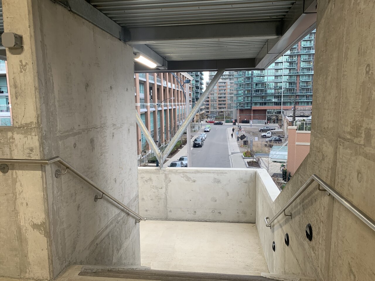 Looking at the stairwells, bicycles could use the minimalist "runnels" at the side of the stairs, whenever the elevator is out-of-service for whatever. However, no "runnels" for wheelchairs. Again, the accountants get their way.