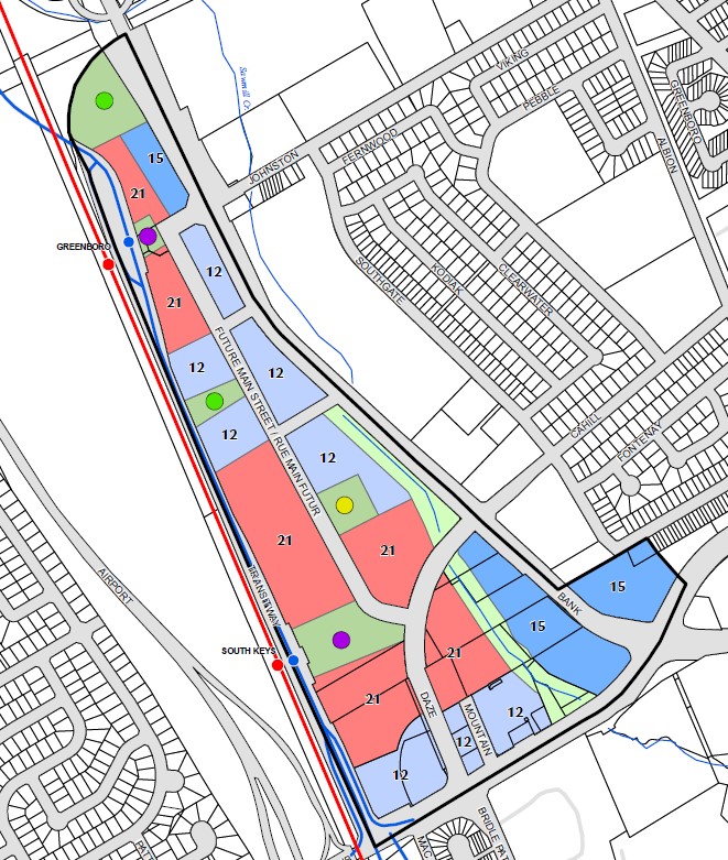 Yes, South Keys will certainly continue getting even more busy, with a lot of development around it. But even with the redevelopment, Greenboro would still only have a handful of buildings on one side, which don't add up to much ridership on their own.You may be forgetting plans to completely rethink the South Keys area. This is the density map with proposed building heights from the city's Secondary Plan. I think they are starting the work at the south end, but eventually Greenboro will have significant walk-in potential.