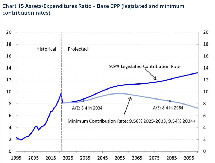 Interesting! I dug up the 2015 Actuarial report, and the projection for assets/expenditures in that report, for 2025, was 6.49x. Compared to actuals of I'm assuming over 10x when we get the updated report. Feels like a big error for 10 years. It's fair that we have to wait until the projections show we can expect 25x ratio to be reached before re-evaluating contributions, but it's also fair to say that the actuarial modelling has been very conservative. They also were projecting 2075 A/E ratio of 7.46x in 2015 vs revised projection of nearly 12x in the last report.