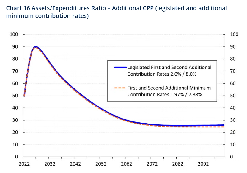 The Additional CPP is also a good comparison, as a fully funded program it's projected to plateau at 25x Assets/Expenditures. And it only requires an equivalent 6% contribution rate instead of 9.9%. Also you can see how big of an impact 9.9% vs 9.56% contribution rates for Base CPP makes.