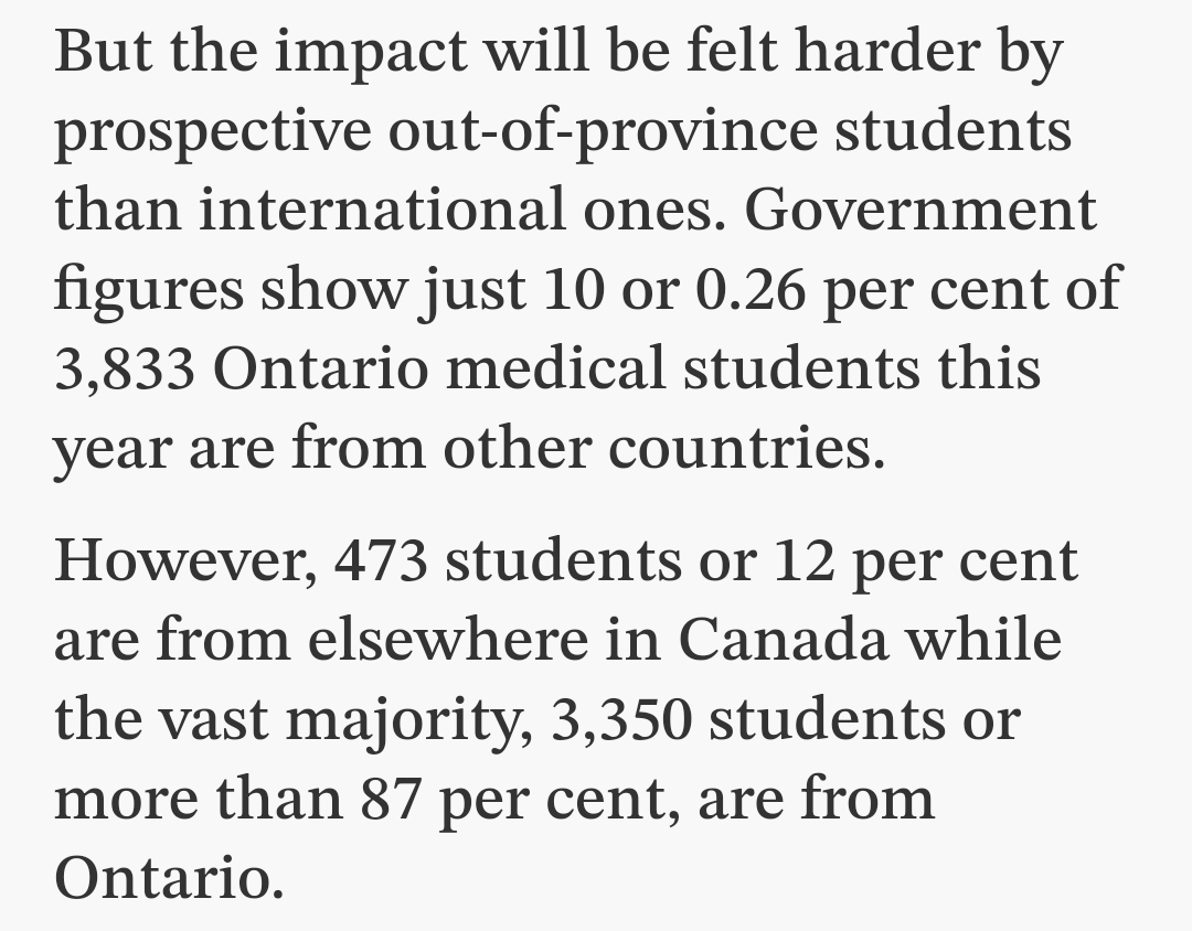 In that light I can see why preventing international students from taking those spots may seem reasonable. But if those international students were willing to commit to staying in Canada and moving to underserved areas of Ontario, then I don't see a downside. Rather than scouring the subcontinent for DoorDash ebikers who then protest when Canada dares to not extend their visas; these pre-meds are the international students we want.