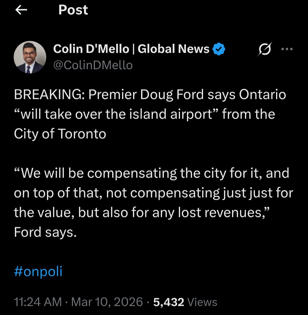 I'm looking to Mark Carney to stop this bullshit. The man is so butthurt that he was rejected by the city — for mayor and for Premier — that he's abusing his power to override the will of the city, to the detriment of the province I might add. Doug Ford is making an extremely good case for Toronto petitioning to separate from Ontario and become its own province or entity.