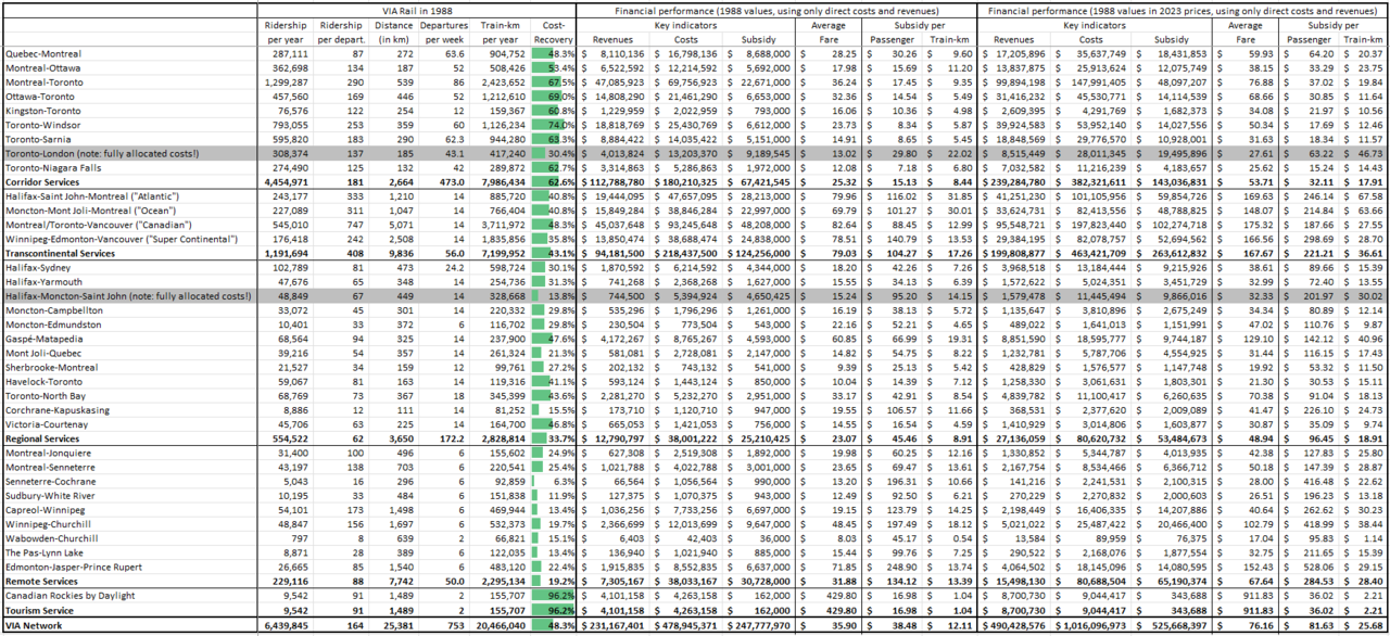 Quick reminder that even in the golden age of VIA (1985-1989), no intercity route outside the Quebec-Windsor Corridor recovered even half of its direct costs, despite most operating daily: