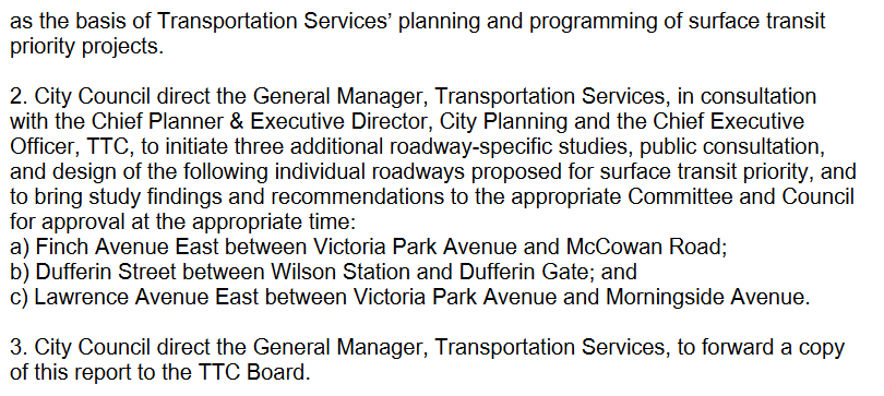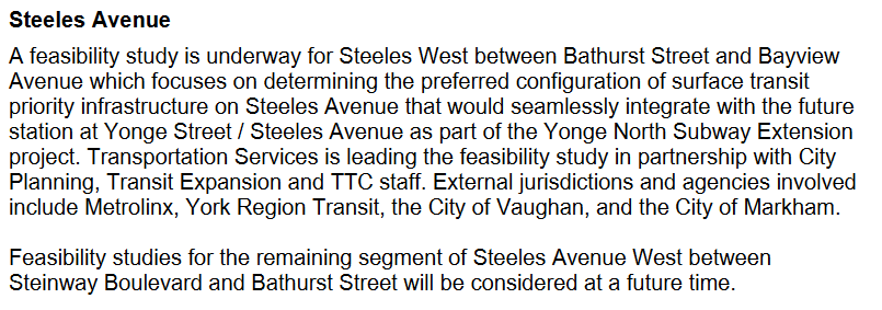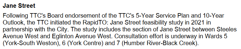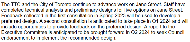 A report to next week's Executive meeting provides an update on the Jane Street work and seeks approval to study 3 additional corridor segments.