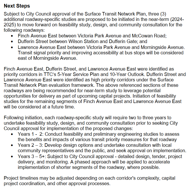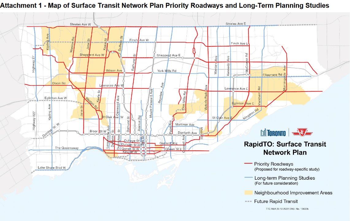The high-level plan has a general set of things that will be looked at (rationalized stops, reserved lanes, queue jump lanes, transit-priority lighting and limited-stop services); along a specific set of roads/routes the TTC has already chosen, based on published criteria.