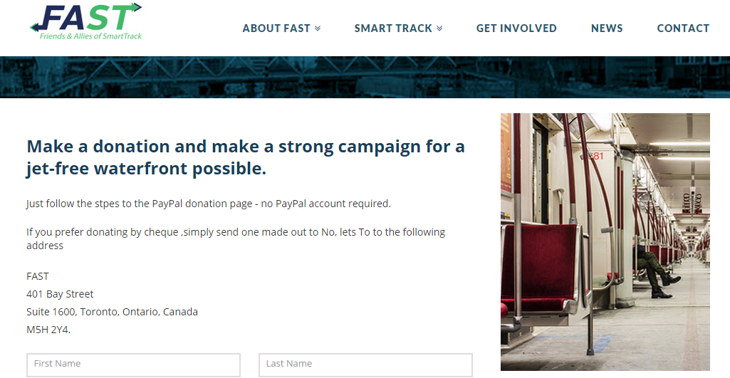 The fact that someone just copy-paste text from the NoJetsTO site for the donation page suggests it's either the same designer, or someone is common to both groups. A SmartTrack advocacy group presumably benefits Tory, but then he also has some interest in maintaining the island airport, right? John Tory Jr works for an airline based there?