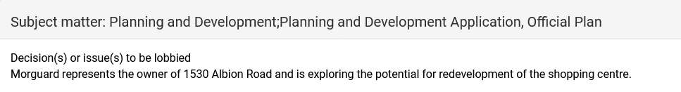 Morguard has registered to lobby the City on behalf of the owner to explore redevelopment options.