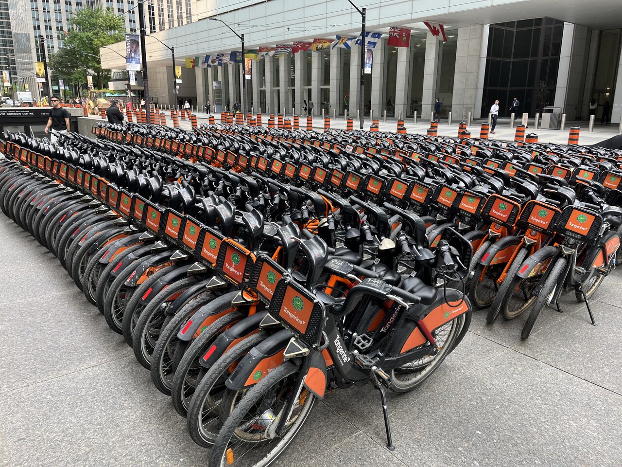 This was the scene last night at BMO Field before the game. There were two broken docks in the stall by BMO Field that tricked everyone checking the app to come over to park their bike. One of the docks actually worked somewhat allowing people to “end their ride” (as confirmed in the app) before rejecting the bike. We piled the "ended rides" bikes in front of the docks.