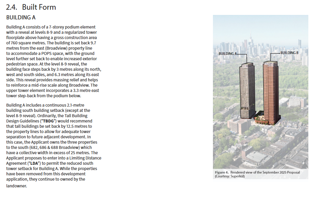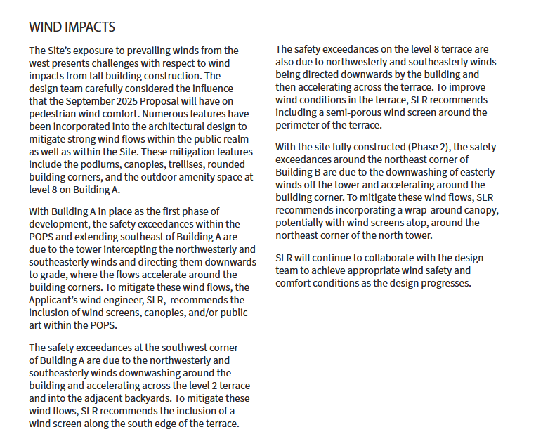 There are potential strategies to mitigate these, but I'm not sold. I'm not convinced the buildings are massed in such a way as to deliver a reasonable outcome, and I think a height reduction may be preferred here. I will look at the Wind Study for more details later.