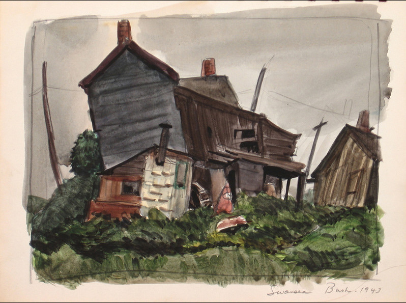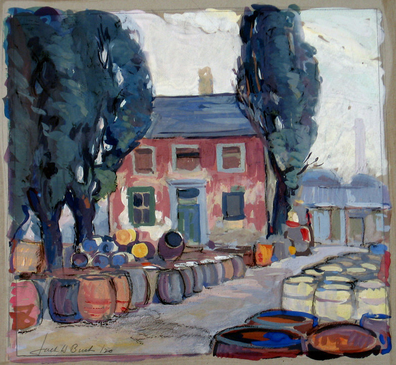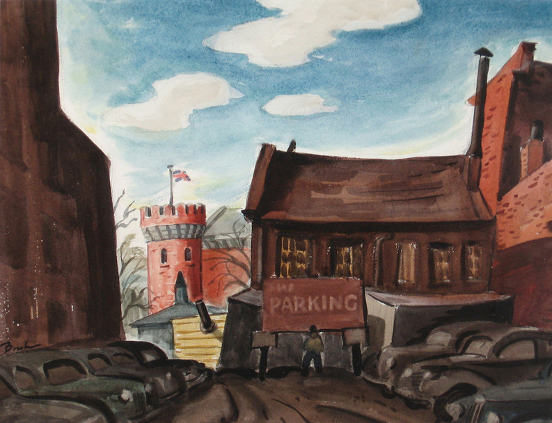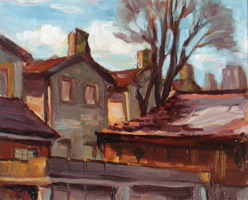 Lights of a City Street is an incredible view of the intersection of King and Yonge Streets, full of unprecedented realism and detail. According to a clock on the main building located on the southeast corner, it is 4:58 p.m. The streets have been dampened by a light rainstorm passing through the city. Looking east, passengers board two of the new streetcars on the King route. In order to capture the temper of the times, Bell-Smith has replicated all of the names of the local businesses which have taken up residence at this busy intersection. We can clearly see the offices of the shipping company, Cunard S.S. Line, situated on the northeast corner, facing King Street.