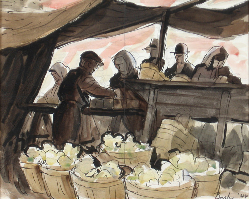 If the faces of the numerous pedestrians milling about in the picture seem incredibly life-like, this is no accident. Bell-Smith set out to create a documentary atmosphere by incorporating real people with whom he was familiar, both professionally and personally. The helmeted policeman, draped in his rain cape and directing traffic, is Constable John William Redford from the Toronto Police Force. Redford was a regular fixture at the corner of King and Yonge, routinely directing traffic as depicted in the painting. Upon retiring from the force, he worked as a security guard for the Simpsons department store on Queen Street at Yonge. Two other significant people are portrayed elsewhere: the gentlemen being swamped by newspaper boys is the artist himself, and the man seen raising his hat in greeting to the women passing by is Bell-Smith’s son, the Reverend F.M. Bell-Smith.