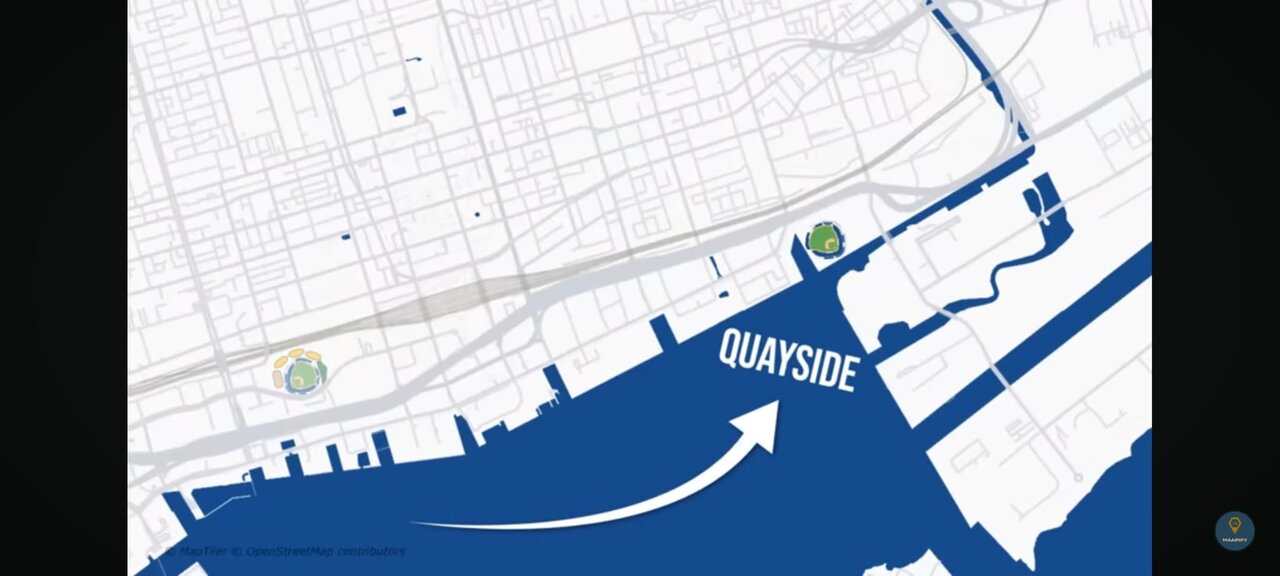 A visual from the 5:45 mark of the video that offer a tangible picture of what a move to the Waterfront redevelopment would/could look like. (Based off the reporting in the 2020 Globe and Mail article that Rogers and the Jays were looking at a waterfront site as an alternative.)