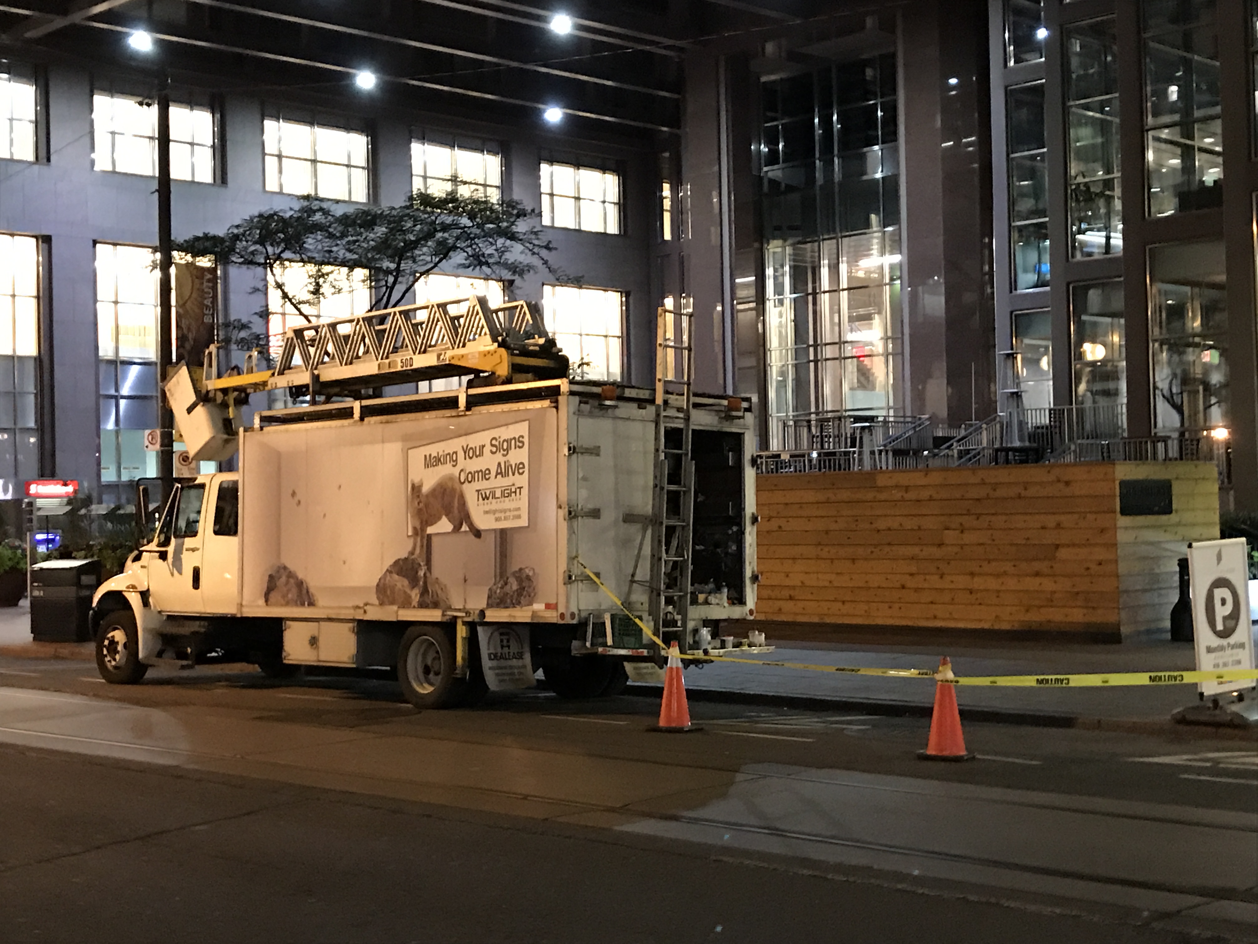 The street level signage is coming off the building formerly known as Trump Tower Toronto.