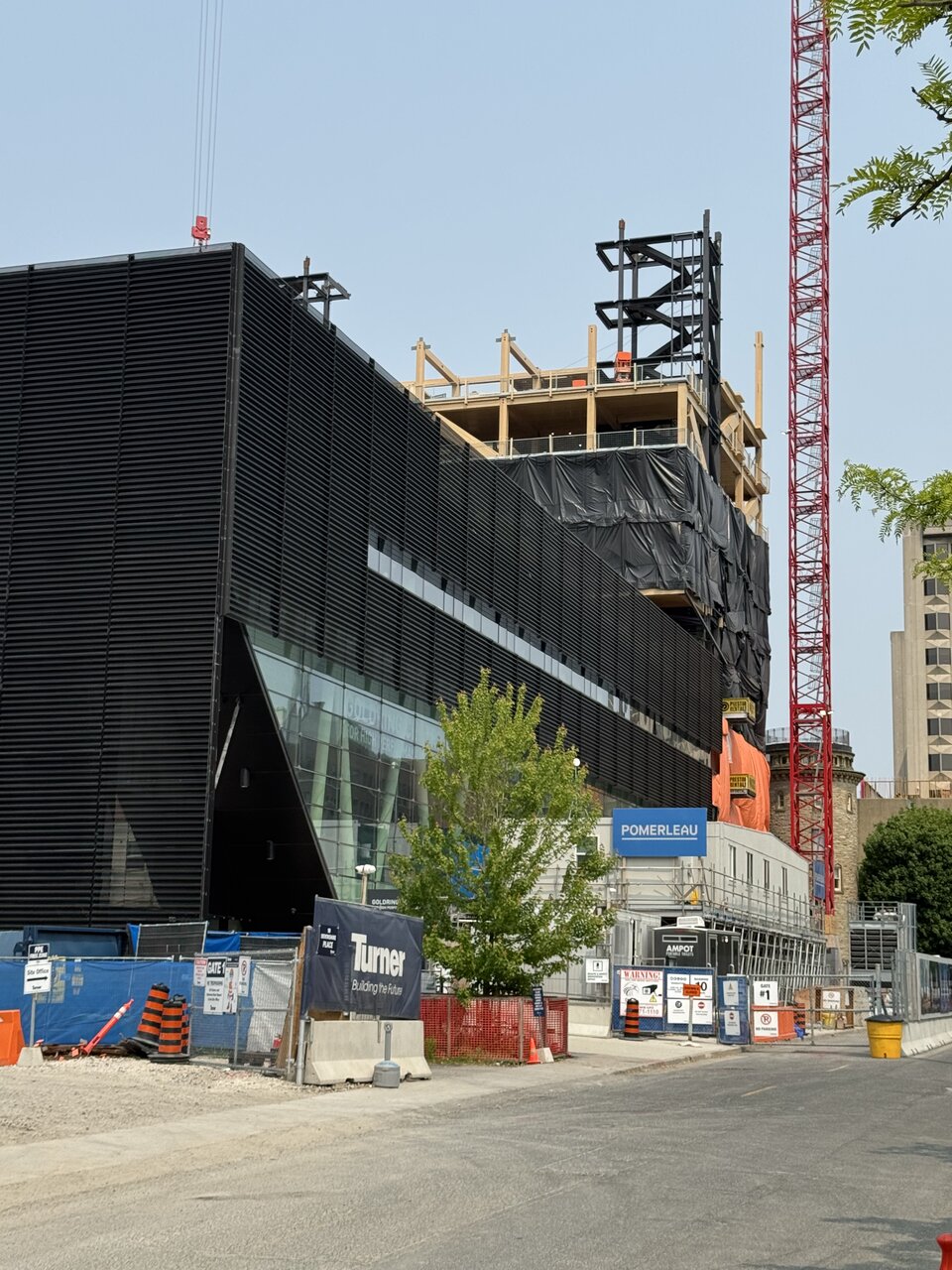 That maybe more of a regulatory thing than admittance of the structure's chosen material shortcomings. Also see: Fire escape.I'm amused by the steel structure for the exit stairs. I don't doubt that the wood construction is safe... but it's almost like the engineers are admitting that it's not *that* safe