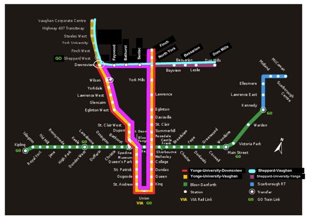 - Yonge-University-Vaughan (yellow) = 4 minutes