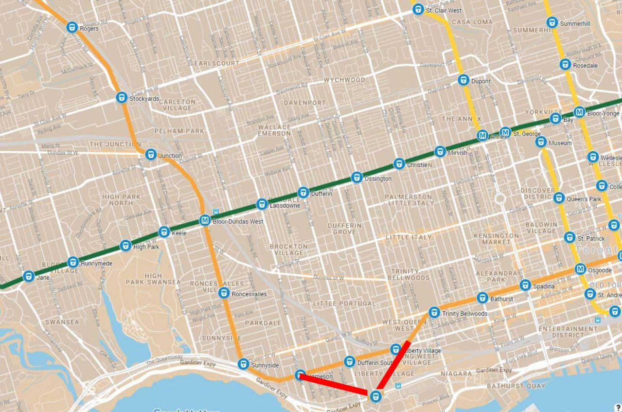 I think instead of hitting "Dufferin South", you'd want to do the exhibition grounds instead (convention centres, BMO field, Medieval times, night clubs, etc.).Here's my western relief concept. In order to cover both Queen and King, I had it dip down to King past Bellwoods, similar to how the east will dip down to Unilever.