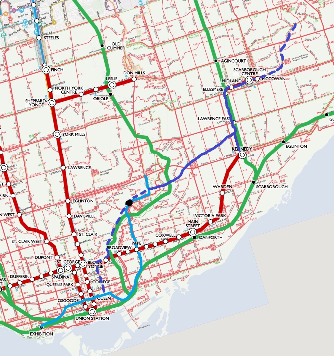 1) In the south, it might not be necessary to go as far as King. If the goal is to limit the cost of building rapid transit, then Dundas may be a cheaper option for the downtown section of the "Scarborough" line. Dundas is close enough to some of the existing destinations, plus the density is very likely to start spilling north as the space south of Queen gets used up.