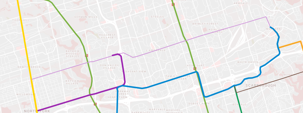 1) Line 4 would curve upwards east of Fairview Mall, running elevated in the 404 ROW, and terminating in a new station on Seneca College campus. This line is really just too expensive to bring all the way into Scarborough and this is a cheap option to get great transit service to Seneca without extending the Finch LRT all the way east.