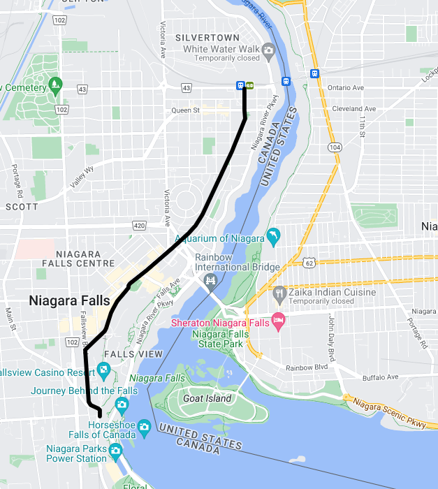 Here is a full map of what I imagine the route could be, starting from where it would diverge from the current route into Niagara Falls.