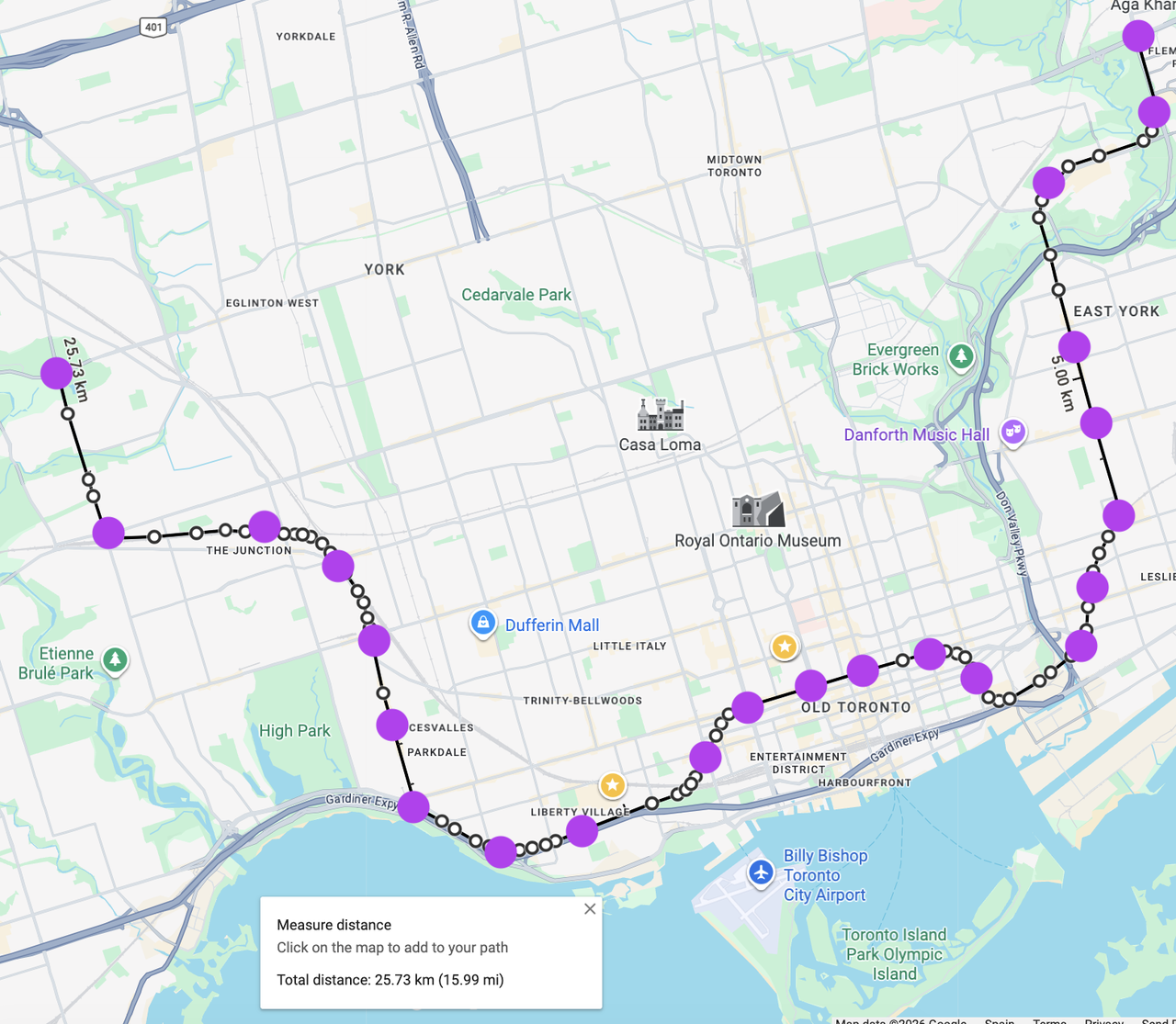 This is what I envision the full line looking like. My hope is that this would set the stage for northward extensions up to Jane and Finch on the west side and up to Steeles on the right side.