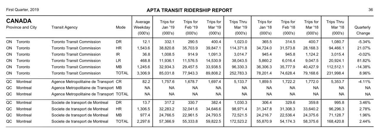 Here is the APTA ridership each month from October 2018 to March 2019 in millions: 5.612, 5.605, 4.935, 11.936, 11.576, 14.530. Did ridership really triple from December to March? Not sure what's going on with their numbers.https://www.apta.com/wp-content/uploads/2019-Q1-Ridership-APTA-1.pdf