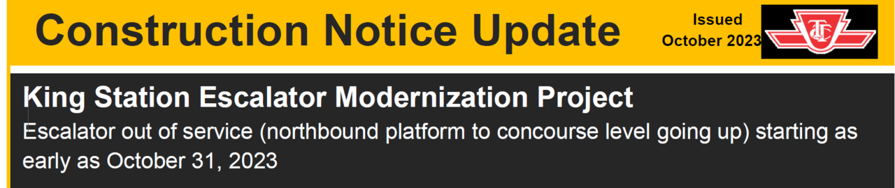 As part of TTC’s Escalator Modernization project, the existing escalator located on the northbound platform going up to the concourse level must be completely replaced with a new escalator. The modernization work includes major improvements to the wall finishes, ceiling and lights.
