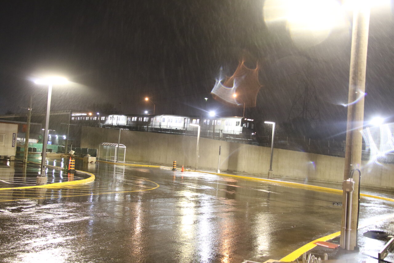 Don't know when Warden temporary bus bays are to open, but far from doing so as of last night. Try to get some shots, but mostly ended up with rain on them. The walkway from the bus bay area .to the concourse is not completed as well from the street. Only saw 5 shelters with 2 on Warden at the current entrance and may miss a few due to the rain and darkness. The cab with the Kiss & Ride area is ready to open at the south end as well the bus bays as they are paved and strip. Going be some long walks getting to/from the North Parking Lot, the street and the bus bays to/from the subway,