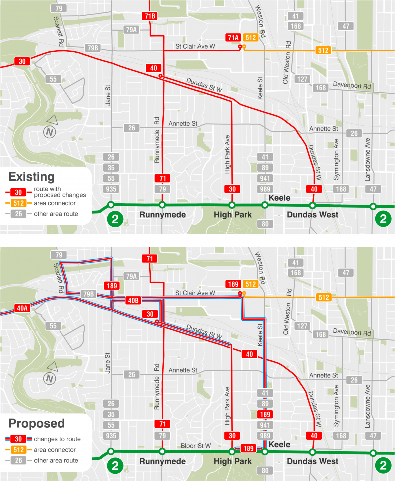 In addition, 189 would operate from High Park Stn via Bloor, Keele Stn, Keele St, backroads around St Clair/Keele, Gunns Loop, St Clair to Scarlett.