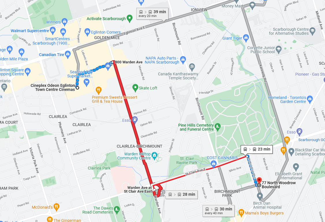 Google doesn't seem to consider walking up and down the stairs, also for my McDonalds trip (victoria park) I'd have to leave the restaurant, then cross the street to get to the bus stop which can add a few mins (so more padding/waiting outside) Also all of this assumes both buses arrive on time.