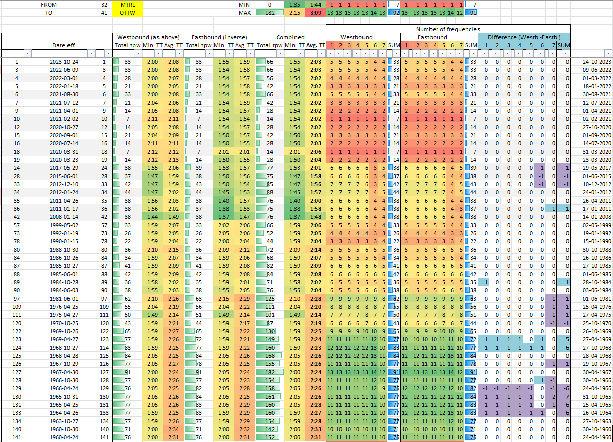Note: above table includes the ex-CP services via Montebello. I might upload a different version later, which excludes them, as they were too slow to be considered a real alternative to services via Alexandria or Rigaud. Actually, turns out I can’t because my built-in function to exclude “indirect” trains would also exclude T-O-M trains…