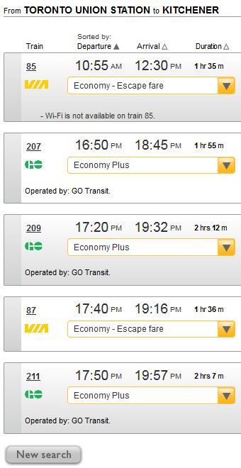 For example, the website only shows 3 out of the 4 GO trains which run direct from Toronto to Kitchener. It omits the 18:50 GO departure while still showing the 17:20 and 17:50 departures which directly compete with VIA train 87.