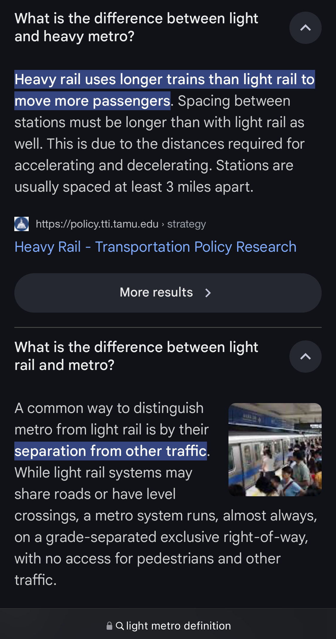 In simpler terms, Rail is more flexible than Metro, Metro is more expensive to build than Rail and Heavy has a higher capacity than Light, which is why Light Metros are a high-cost-low-capacity solution which only really make sense as people movers at airports (where you only need to cover short distances, but can’t operate at grade), whereas Ottawa (Confederation Line) and Montreal (REM) chose such a bad fit (for urban transit applications) at their own peril…