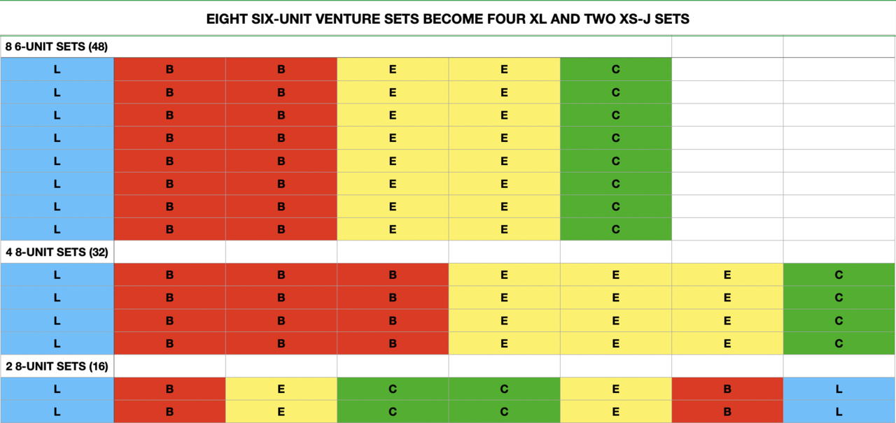 VIA's plan to reconfigure its Venture sets. Two XL sets and one SX-J set are already complete. (L=locomotive, B=Business, E=Economy, C=cab car.