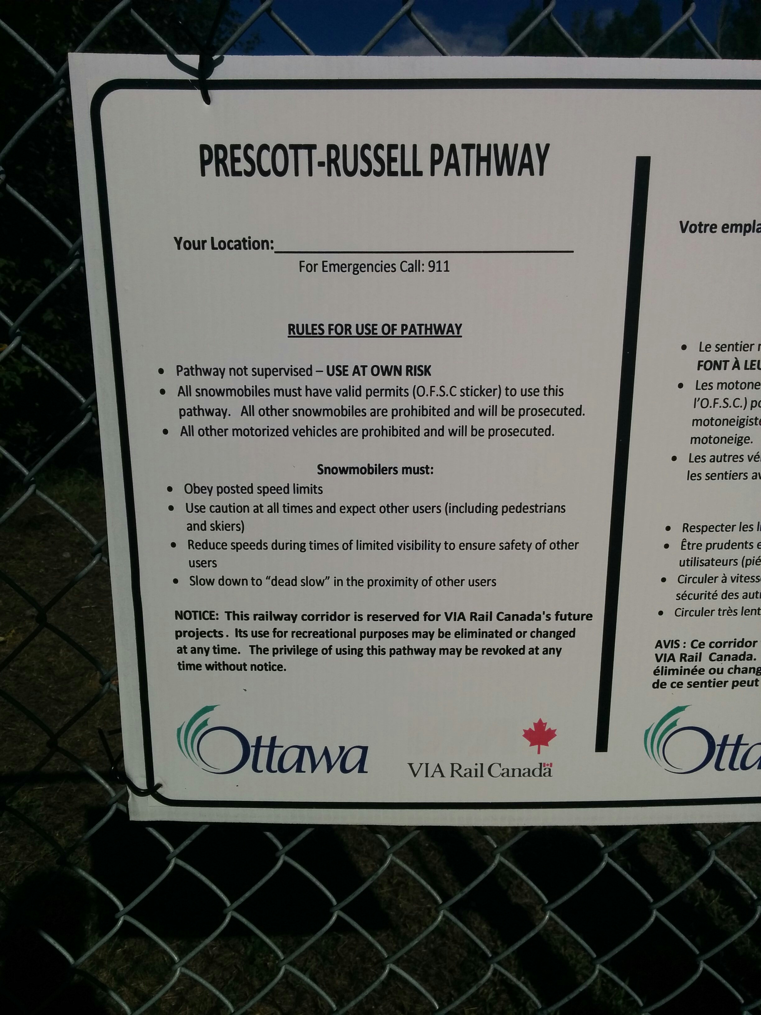 Just a note on the Ottawa-Montreal section. Via Rail owns the Prescott-Russel pathway corridor which the City of Ottawa leases. I took a picture this summer of a sign on the pathway which shows that the corridor "may" be used for a future Via Service. Via might end up using that corridor as part of HFR between tor-ott-mon.