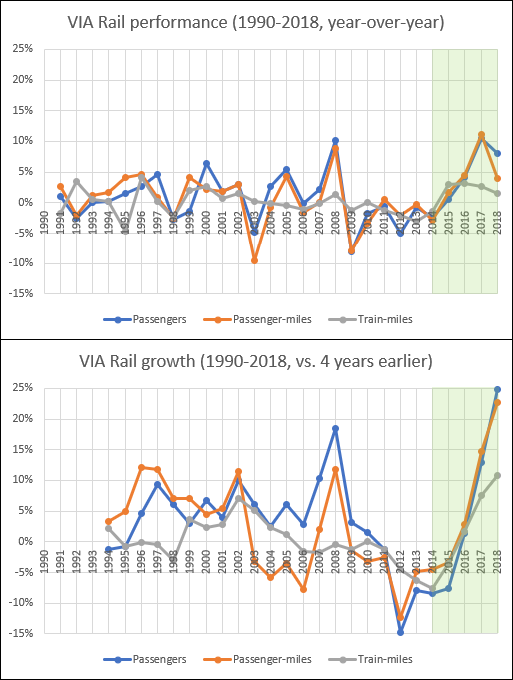 Ridership and train mileage growth (1990-2018, year-over-year or vs. 4 years earlier)