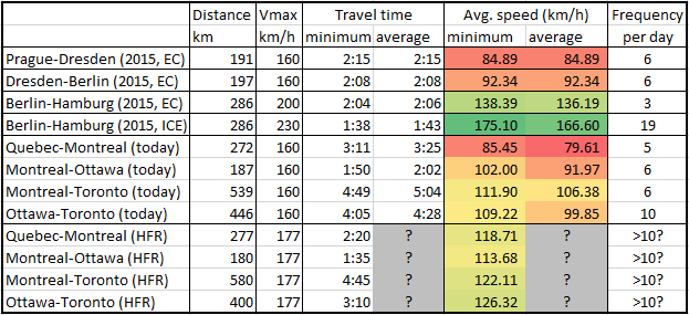 Source: Fernbahn.de timetable archive (for Berlin-Dresden), official VIA Rail timetable (effective 2019-06-02) and official VIA Rail presentation (for HFR)
