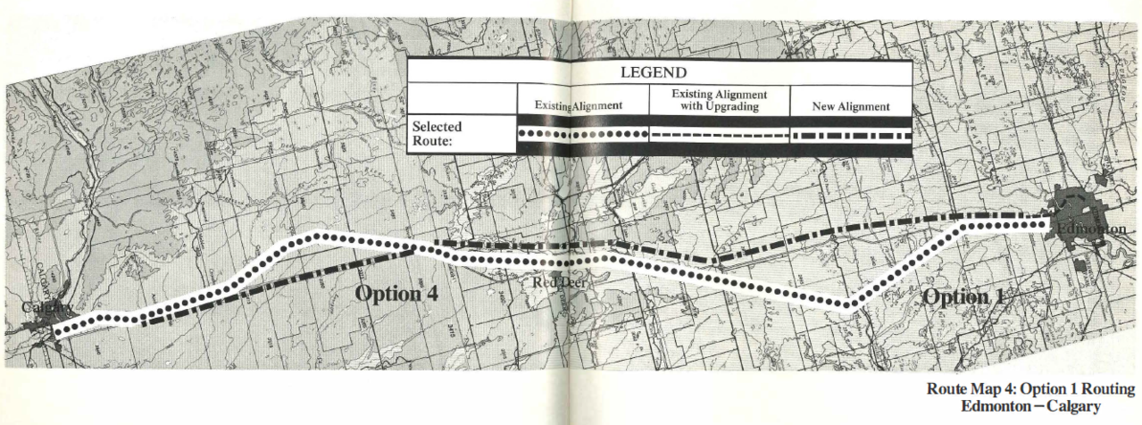 The 80s study called for a CPR alignment with mostly double track, with the ability to pass freight using high speed crossovers. I believe the more modern studies call for sterile HSR track outside of the city limits of Edmonton and Calgary.